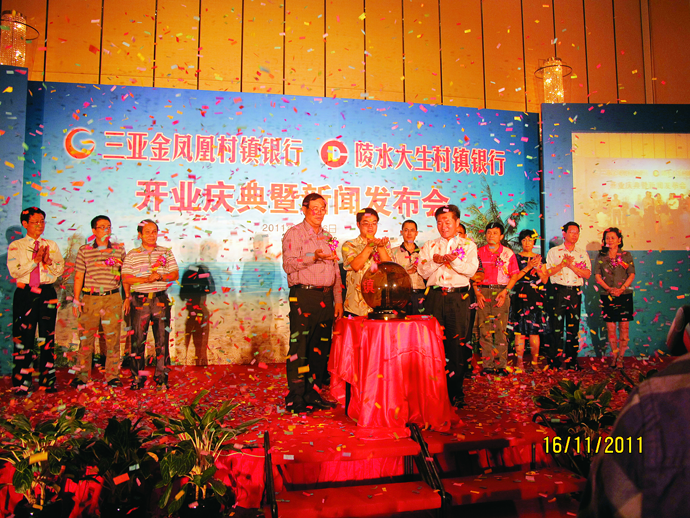 11月16日,三亚金凤凰村镇银行、陵水大生村镇银行开业庆典暨新闻发布会在三亚湾海居铂尔曼度假酒店举行。日照市副市长刘西良,三亚市人大常委会副主任陈家忠、市政府副市长顾景奇,陵水县委常委、县政府常务副县长杨松振、县人大常委会副主任陈洪、县政协副主席许录游,海南银监局杨峰副处长,三亚市政府金融办主任姚晓君,人民银行三亚市中心支行副行长林书明,三亚银监分局局长王洪彬、副局长史小燕,《银行家》杂志社社长阎美玲,我行党委书记、董事长费洪军出席庆典仪式。我行副行长闫鸣主持仪式。